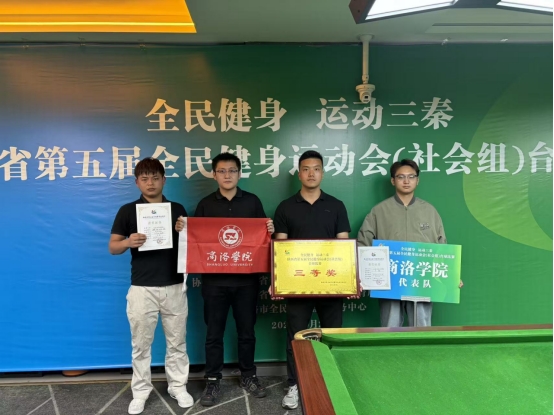 9月22-25日,陕西省第五届全民健身运动会社会组(台球项目)决赛现场传来捷报,商洛学院台球队由黄显忠老师担任领队,王健、王品老师教练员首次组队参赛,商洛学院学子王崇懿、杜钊伟、刘雨辛、高浚铨、李楠、董龙龙凭借稳定发挥与出色战术,一路过关斩将斩获三等奖,为学校在台球运动领域实现“零的突破”,展现了新时代大学生多元发展的青春风采。